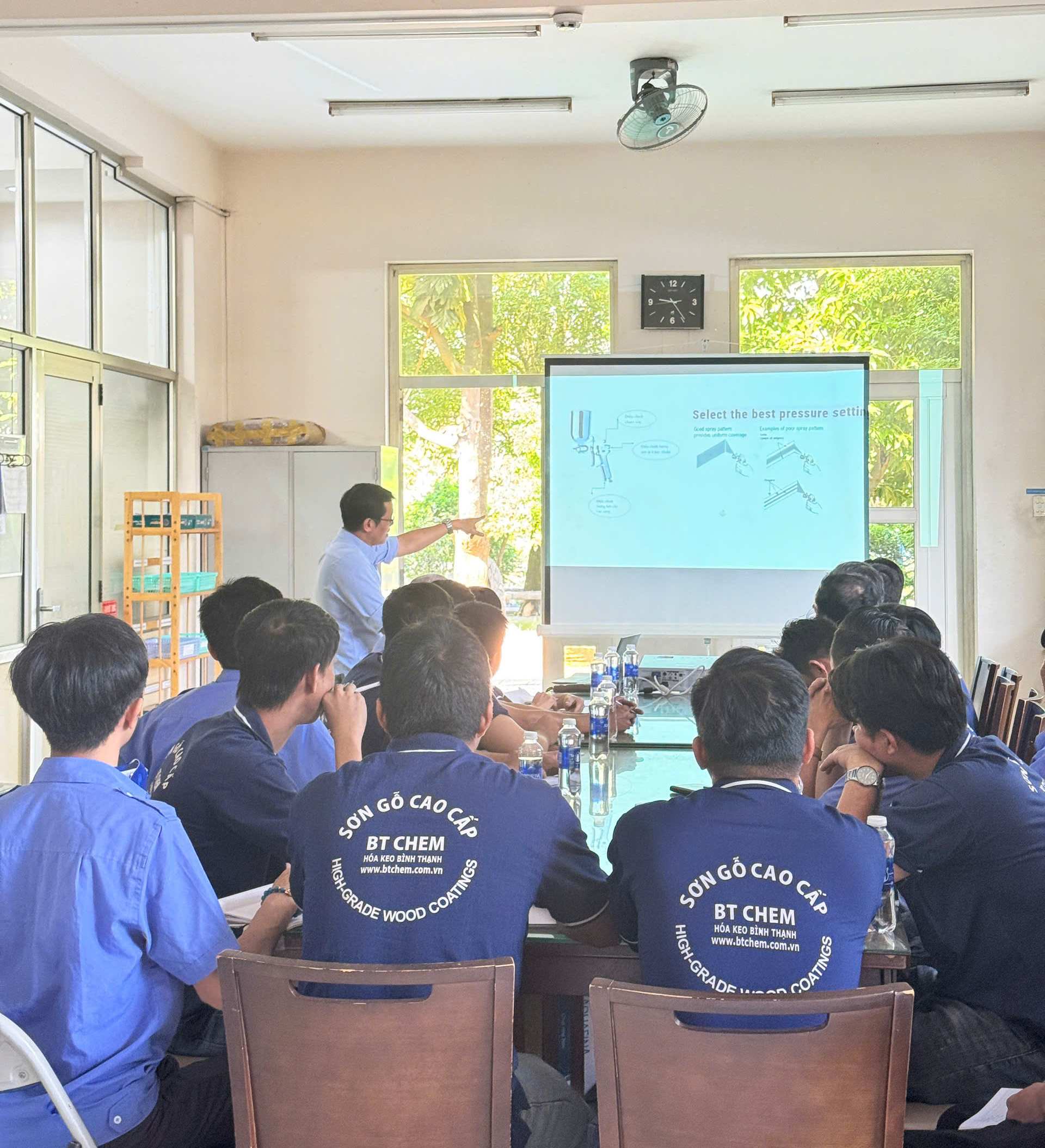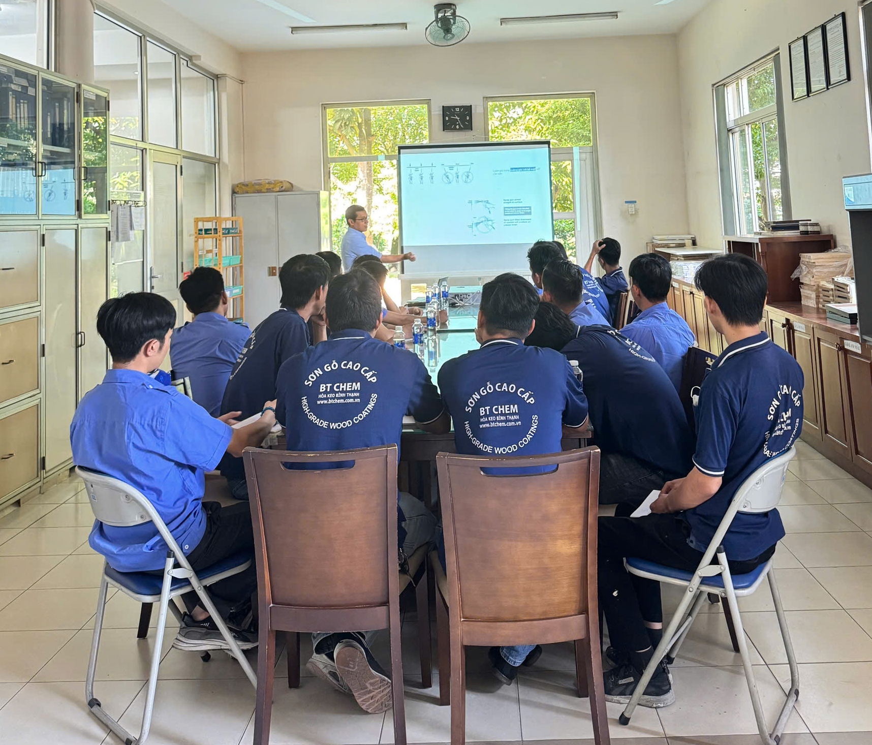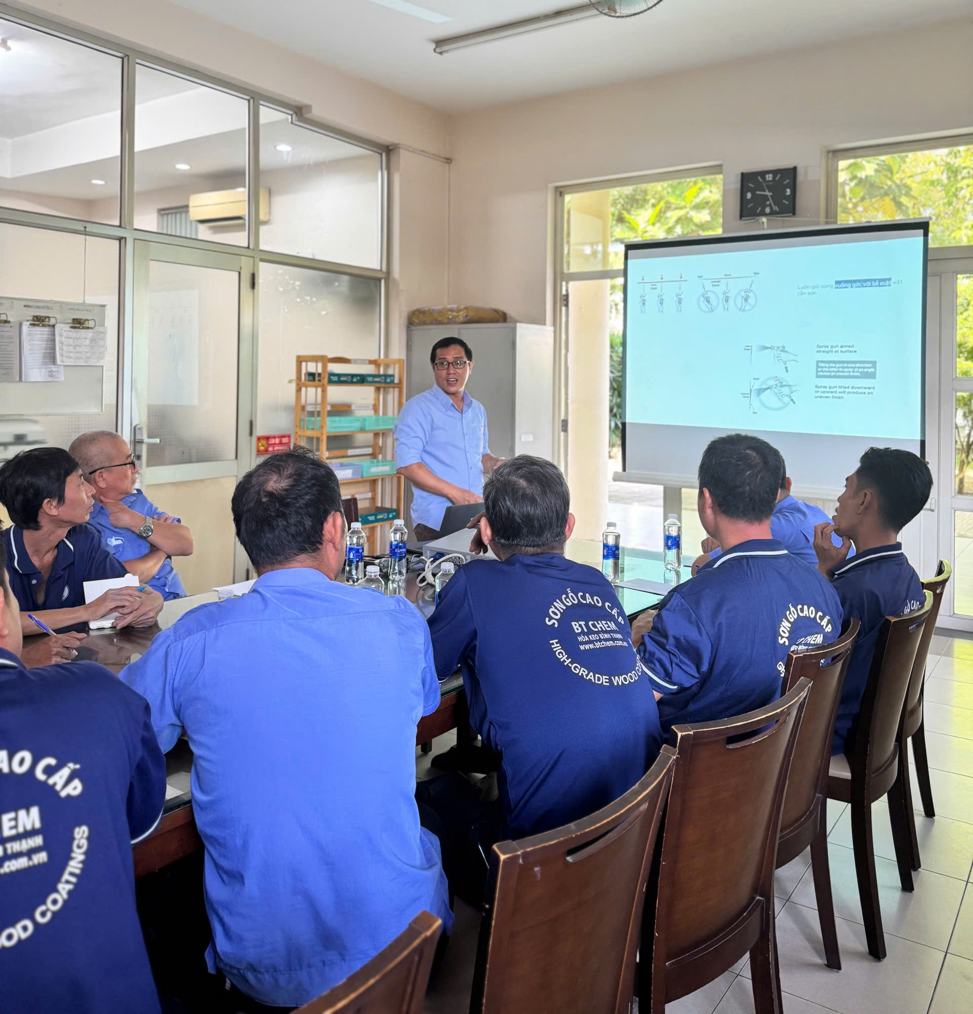 Chương trình được trực tiếp hướng dẫn bởi Phó Giám Đốc Ngô Đức Minh cùng với Trưởng phòng Kỹ thuật Lê Xuân Bảy – những người có nhiều năm kinh nghiệm trong lĩnh vực sơn và hoàn thiện bề mặt gỗ. Sự tham gia của Ban lãnh đạo và chuyên gia kỹ thuật khẳng định cam kết của Công ty trong việc chuẩn hóa quy trình và nâng cao chất lượng sản phẩm.
